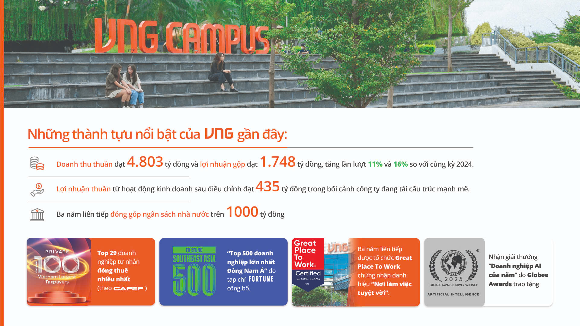 Sau 20 năm, VNG đã vững vàng trong nhóm công ty công nghệ hàng đầu Việt Nam và Đông Nam Á, đồng hành tích cực với tiến trình Chuyển đổi số và xây dựng Kinh tế số quốc gia, với gần 4.100 nhân viên đang làm việc tại 10 thành phố khắp toàn cầu.