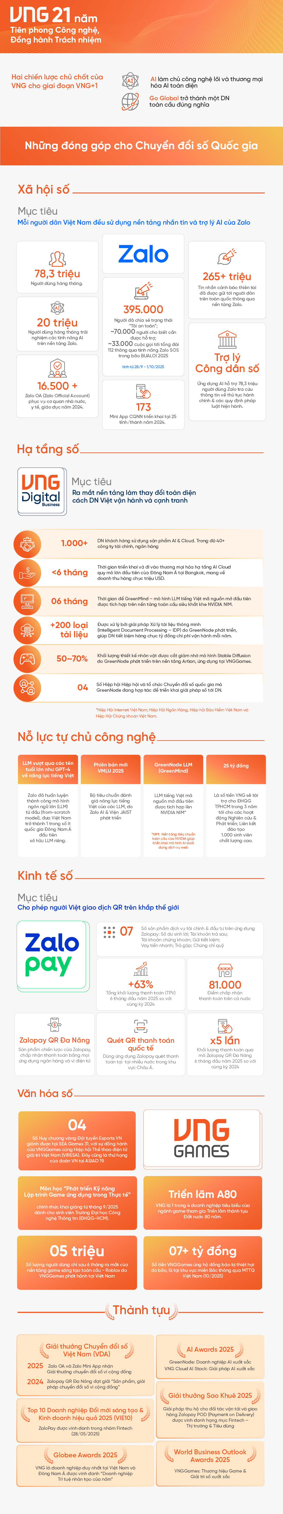 Khởi đầu từ một start-up công nghệ, VNG đã không ngừng mở rộng hành trình sáng tạo, đầu tư mạnh cho nghiên cứu - phát triển, kiến tạo nên những sản phẩm công nghệ thiết thực làm thay đổi cuộc sống hàng chục triệu người Việt. Sự phát triển của VNG cũng gắn liền với hành trình chuyển mình của Việt Nam, từ một quốc gia chỉ vừa “du nhập” Internet những năm 2004 đến một trong những nền kinh tế số năng động nhất khu vực vào năm 2025.