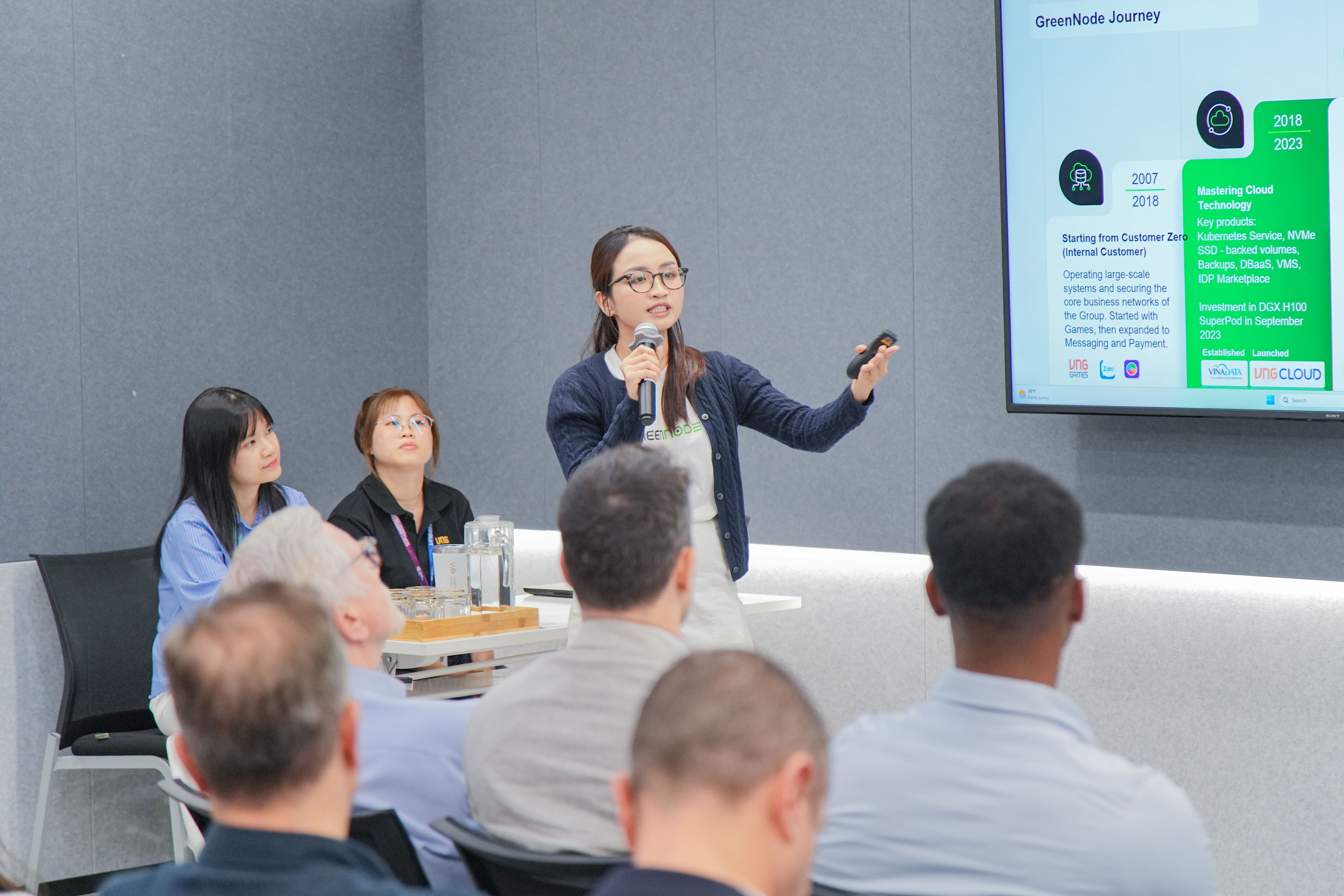 Bên cạnh đó, bà Hồ Thục Hảo – Head of Product Marketing & Branding, GreenNode cũng đã giới thiệu tổng quan về hệ sinh thái AI Cloud của GreenNode, cùng những nỗ lực của VNG trong việc xây dựng nền tảng hạ tầng và công nghệ AI phục vụ doanh nghiệp tại Việt Nam.